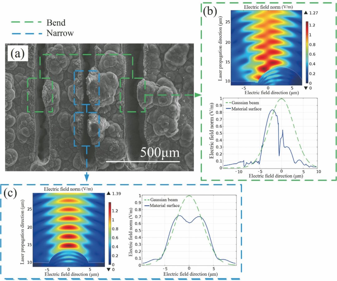 CMC-SiC主要由最外側的SiC層和內部的SiC基體、纖維及界面層組成,在纖維編織結構中還包含許多微小孔隙,復雜的材料結構致使CMC-SiC在激光加工過程中會產生與一般均質材料不同的物理和化學變化。在纖維增強復合材料與激光相互作用機理方面,國內外學者基于理論與實驗進行了大量探索。吳恩啟等理論研究了碳纖維增強復合材料的熱傳導規(guī)律,推導出了復合材料內部纖維束平面內熱擴散系數(shù)與相位梯度的關系。纖維編織復合材料具有各向異性的特點,纖維束方向會直接影響熱傳導規(guī)律,且復合材料的熱擴散系數(shù)與編織方式和基體材料分布相關。Allheily等研究了高能量激光對碳纖維增強復合材料的燒蝕機制,發(fā)現(xiàn)碳纖維增強復合材料對激光輻照產生的熱量具有很強的隔絕作用,主要原因在于碳纖維能夠承載并吸收熱量,層間基體材料的燒蝕可以有效降低激光能量的積累。Zhai等使用波動光學仿真軟件分析了C/SiC原始表面粗糙度對激光加工效果的影響,仿真結果表明C/SiC原始表面形貌對激光刻蝕效果有顯著影響,激光輻照在C/SiC表面凸起的不同位置時,電場會發(fā)生偏移或減弱,電場強度的不均勻分布導致C/SiC表面不同區(qū)域的刻蝕形貌存在差異,如圖2所示。