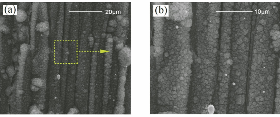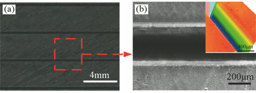 為了控制CMC-SiC中由激光熱作用導致的加工缺陷利用超短脈沖激光對CMC-SiC 進行精密加工成為國內外學者研究的熱點。蔡敏等對比了納秒激光和皮秒激光的SiC/SiC加工效果,結果表明:納秒激光加工過程中材料表面同樣存在熱影響區(qū),導致激光輻照區(qū)域產生了重鑄層、分層及微裂紋等缺陷;利用皮秒激光加工,相對納秒激光,SiC/SiC的加工質量有顯著提高,激光輻照區(qū)域未發(fā)現(xiàn)熱影響區(qū),即重鑄層、分層、微裂紋等缺陷在皮秒激光加工中得到了有效抑制。Liu等利用皮秒激光開展了C/SiC的微孔加工實驗,研究發(fā)現(xiàn):當激光功率密度較低時,孔內形成的反沖氣壓同樣較低,導致孔內碎屑不能有效噴出;升高激光功率密度后,加工過程中孔內產生強烈的沖擊波,形成的反沖高壓使得碎屑從孔內高速向外噴射,微孔加工質量明顯提高。Moreno等開展了飛秒激光加工纖維增強復合材料的實驗研究,發(fā)現(xiàn)內部基體材料的尺寸和形狀對激光加工質量存在較大影響。在飛秒激光參數(shù)的合理調控下,纖維增強復合材料獲得了良好的加工質量。Zhai等在SiC/SiC上利用飛秒激光進行了多種微結構的制備研究,檢測報告顯示SiC/SiC加工區(qū)域輪廓清晰,沒有出現(xiàn)機械加工常見的崩邊、纖維拔出,以及長脈沖激光加工中明顯的熱影響區(qū)。為了驗證加工效果,利用飛秒激光在SiC/SiC表面制備了大面積的微槽結構,加工效果如圖8所示。