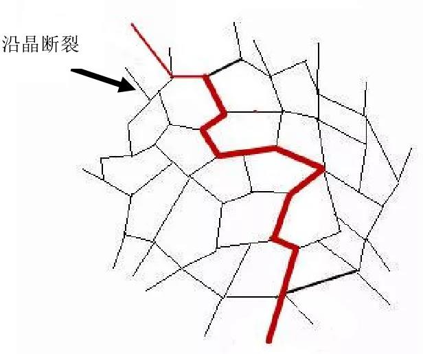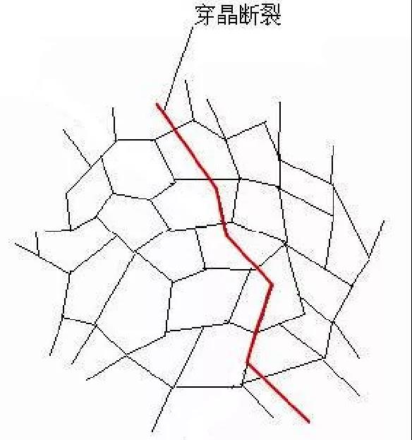穿晶斷裂是裂紋在晶粒的內(nèi)部進行擴展。穿晶斷裂一般是韌性斷裂,當(dāng)其內(nèi)部積累了大量的位錯時晶粒本身的強度下降,進而導(dǎo)致裂紋在晶粒的內(nèi)部產(chǎn)生。